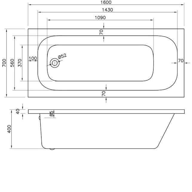 - 1600 x 700mm single ended bath