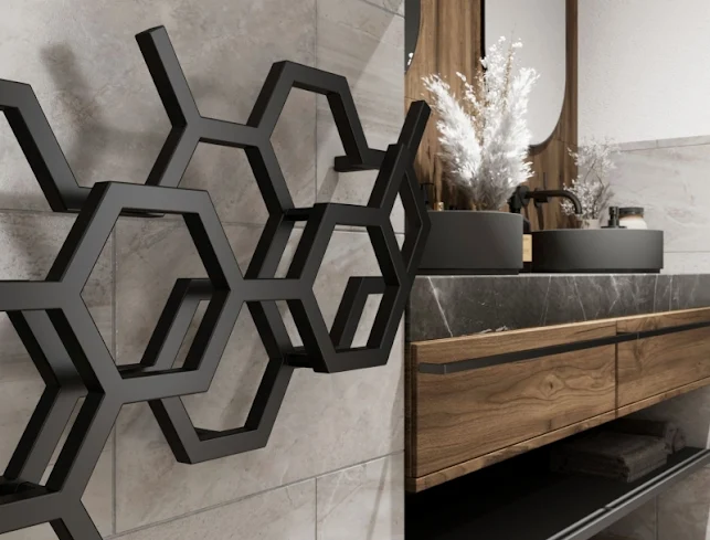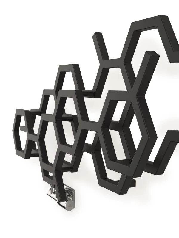 The exposed peg sections from the partial hexagonal shapes are perfect for hanging tea towels, bathroom towels, or even clothes on, offering a utility to the Hex designer radiator in both bathroom, kitchen, or living spaces around the home.