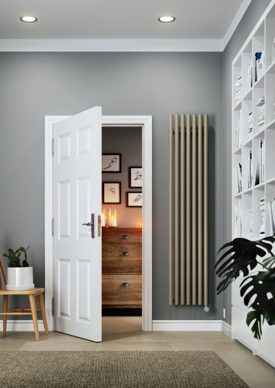 The beautiful, elegant design is complimented with a distinctive Quartz Mocha, matt, rough texture, presenting a completely unique vertical designer radiator that effortlessly integrates into minimalist interiors of modern design.