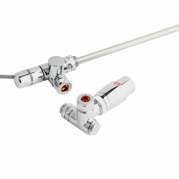 Cleverly designed to negate the need for a separate T-Piece, the Towelrads Dual Fuel TRV allow for a minimalistic design approach to installing a dual-fuel thermostatic towel rail in your bathroom. This valve set-up will allow temperature control of both the central heating and electric heating of a towel rail completely separately, giving you complete control over the heating of your bathroom, straight at the towel rail.